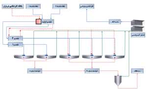 آب سرریز تیکنرهای باطله به همراه آب برگشتی از تیکنرهای خمیری به سمت استخرهای آب برگشتی هدایت و سپس از آنجا به کارخانه پرعیارکنی ارسال میشود.