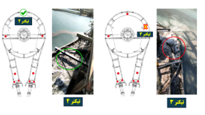 محل برخورد بار درون چاهک تیکنر ۴ در مرکز چاهک و در ساعت ۱۲ میباشد که به صورت اصولی میباشد اما در تیکنر ۳ بار در نقطه مرکزی و ساعت ۱۲ با هم برخورد نمیکنند بلکه بار در یک سمت چاهک و در ساعت ۲ با یکدیگر برخورد میکنند (شکل ۵).