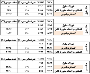 جدول ۳: آنالیز عیاری خوراک، کنسانتره دوش و افشانه مخروط کامل