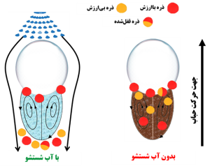 همانطور که در شکل ۳ مشاهده میشود. در حالتی که آب شستشو وجود نداشته باشد، به دلیل حرکت حباب به سمت بالا منطقه کم فشاری پشت آن بوجود آمده که ذرات بی ارزش و ذرات قفل شده داخل آن به دام می افتند. درصورت استفاده از سیستم شستشو، آب تمیز جایگزین آب پشت حباب میشود و ذرات بی ارزش را به پایین هدایت میکند.