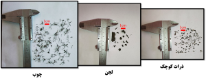 همچنین ذرات ریز به سه دسته ۱/۵، ۲ و ۳ میلیمتر تقسیم شدند (شکل ۸). تعداد این ذرات برابر با ۱۲۵ عدد است. در صورتی که هر دوش ۱۶۵ عدد روزنه ۱/۵ میلیمتری دارد.