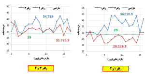 درکارخانه مولیبدن عوامل ایجاد این نوسان بررسی گردید و طی پایش هایی که انجام شد یکی از این عوامل نوسان درصد جامد در خوراک مرحله پرعیارکنی اولیه ( رافر) بود که این درصد جامد میبایست طبق طراحی ۲۹ درصد باشد اما برای رافر۱، ۳۶ درصد با انحراف معیار ۱۰/۹ و برای رافر ۲، ۲۶/۱ درصد با انحراف معیار ۶/۳ و برای رافر ۳ ، ۳۴/۷ درصد با انحراف معیار ۹ و برای رافر ۴، ۳۱/۷ با انحراف معیار ۵/۹ بود که دارای نوسان است (شکل ۴).