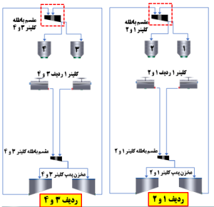 از عوامل دیگر ایجاد نوسان در دبی و عیار، تقسیم نامناسب باطله شستشو ۱ ( کلینر۱) بود که مسیر آن به اینصورت است : مرحله شستشو ۱، ۴ ردیف است. باطله ردیف ۱ و ۲ به ۲ حوضچه پمپ منتقل میگردد و پس از آن با استفاده از پمپ ردیف ۱ و ۲ به مقسم باطله شستشو ۱ ( کلینر) انتقال پیدا میکند. این مقسم بار خود را بین تانک های حالت دهنده شماره ۱ و ۲ تقسیم میکند که برای ردیف ۳ و ۴ نیز به همین صورت بار انتقال میابد (شکل ۵).