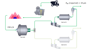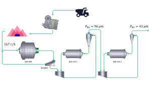 مدار آسیاکنی کارخانه سرباره طبق طراحی اولیه، دارای دو آسیای گلولهای سری به همراه دو خوشه هیدروسیکلون بود. دانهبندی خوشه سیکلون اول دارای P80 برابر با ۹۳میکرون و خوشه دوم P80 برابر با ۴۳ میکرون تعیین شده بود.