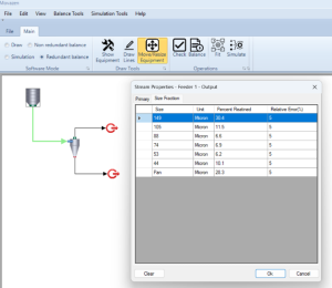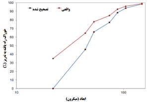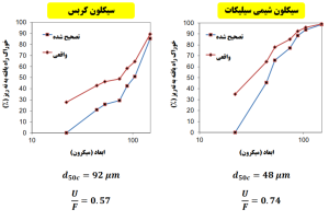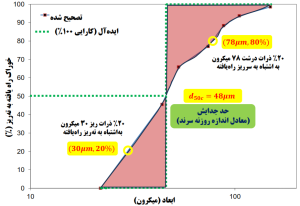 در مرحله بعد باتوجه به تعدیل دادهها، دو نمودار تصحیح شده (آبی رنگ) و تصحیح نشده (قرمز رنگ) کارایی سیکلون رسم میشوند. نمودار کارایی متشکل از دو محور افقی که نشاندهنده ابعاد ذرات و همچنین محور عمودی که کسر خوراک راهیافته به تهریز است. در نهایت تمام بررسیها از طریق نمودار تصحیح شده انجام میشوند.