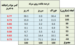 همانطور که در شکل ۵ مشخص است، پس از دانهبندی برای هر ۳جریان خوراک، سرریز و تهریز نمونه از سیکلون چینی ساخت شیمیسیلیکات، درصورتی که کسر مواد راه یافته از خوراک به تهریز برای هر سرند را محاسبه کنیم، بایستی عدد یکسانی باشد. در غیر اینصورت نشان میدهد که دادهها دچار خطای نمونهبرداری است و بایستی دادهها را تعدیل کنیم تا در نهایت به یک عدد واحد برسیم.