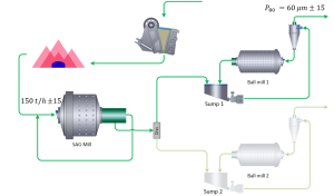 سربارهها با ابعاد ۱۰۰% زیر ۵۰۰ میلیمتر و عیار متوسط (بر اساس طرح) ۱٫۷ % مس خوراک سنگ شکن فکی را تأمین میکند. بالای این مخزن، شبکه فلزی (سرند گریزلی) وجود دارد. اندازه روزنه سرند گریزلی ۵۰ ×۵۰ سانتیمتر میباشد. ذرات با ابعاد کوچکتر از ۵۰۰ میلیمتر توسط خوراکدهنده زنجیری وارد سنگشکن فکی شده و پس از خردایش به اندازه زیر ۱۵۰ میلیمتر میرسند. مواد پس از خردایش در سنگشکن فکی، به انبار ذخیره (Stockpile) منتقل میشود. در انبار ذخیره، مواد توسط سه خوراکدهنده نواری (بالای هر خوراکدهنده دو عدد شوت وجود دارد) به نوار ۲۰۰۵ که خوراک آسیای نیمهخودشکن را تأمین میکند، انتقال داده میشود. ذرات عبورکرده از سرند (کوچکتر از ۶ میلیمتر) به مخزن خوراک هیدروسیکلون انتقال مییابد. در حال حاضر با توجه به مناسب بودن دانهبندی آسیای شماره ۲ از خط خارج است و سرریز هیروسیکلون خوشه یک مستقیما به مدار فلوتاسیون فرستاده میشود (شکل ۱).