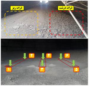 شکل ۱۰ در قسمت بالا نمایی از انبار ذخیره کارخانه سرباره را نشان میدهد. باتوجه به ریزش مواد از بالا به داخل انبار ذخیره، مواد درشتتر در سمت راست تصویر و موارد ریز در سمت چپ قرار گرفتهاند. در قسمت پایین شکل ۱۰، نمایی از کف انبار ذخیره مشخص شده که شش دهانه خروجی میباشند. یکی از مهمترین دلایل نوسان عیار خوراک ورودی به کارخانه، عدم بارکشی همزمان از هر شش خوراکدهنده انبار ذخیره میباشد.
