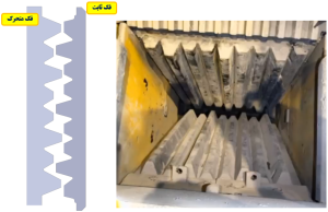 طی بررسیهای انجام شده، طراحی، ساخت و نصب فکهای کتابیشکن انجام شد. این فکها باتوجه به هندسهای که دارند، امکان عبور قطعات کتابیشکل در محصول آسیا به صفر میرسد (شکل ۷). پس از ورود قطعات کتابیشکل به داخل سنگشکن، قطعه کتابی بین دندانههای بلندتر گیر افتاده و امکان عبور را ندارد.